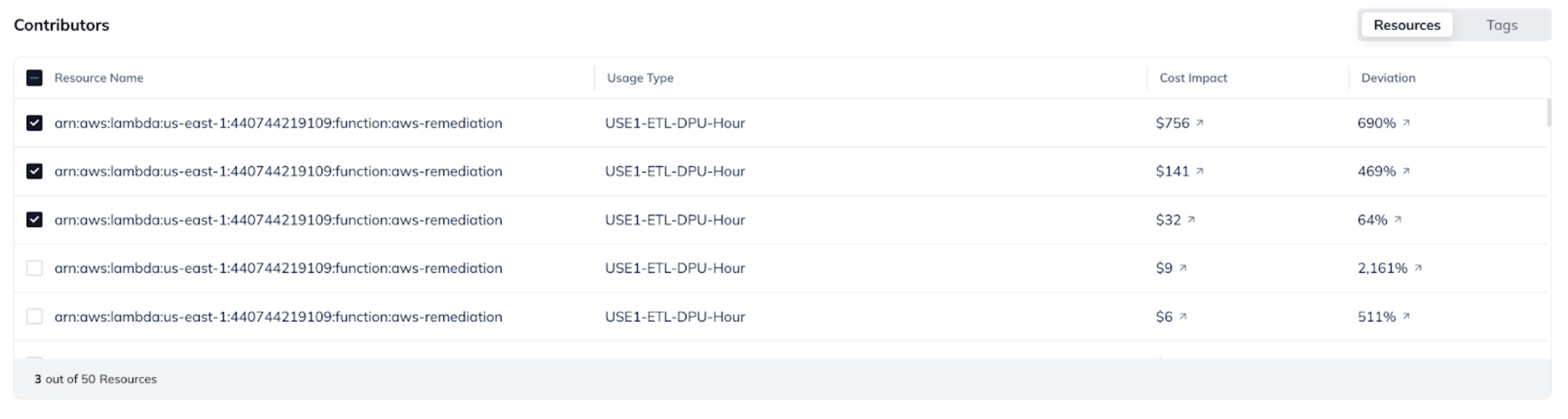 Each anomaly includes a recommended set of contributing attributes most likely involved in the spike. This helps engineers quickly narrow down the root cause by highlighting the specific resources, services, tags, or accounts most likely responsible for the spike. At the most granular level, this includes resource IDs and usage types; at higher levels, you may see services or account names.